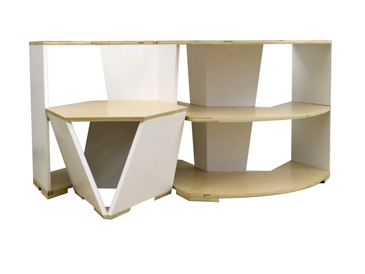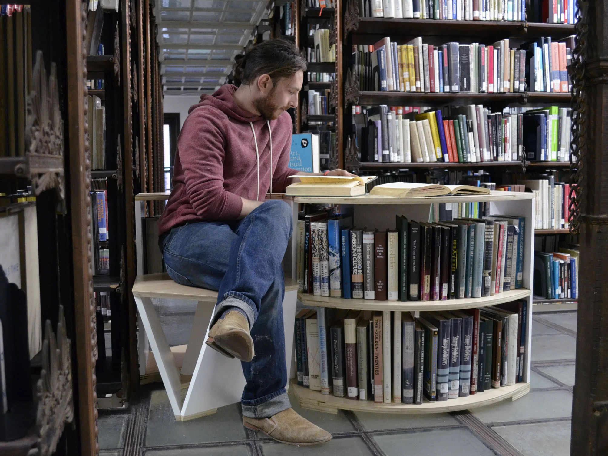 This interlocking stool and table display with shelving unit serves as a moment of pause as active book hunters peruse through used bookstores. Its situation between or at the end of existing shelves allows for it to stimulate conversation, while creating a comfortable environment that the user would want to spend time in – increasing the likelihood that they would purchase the pieces they are most interested in.